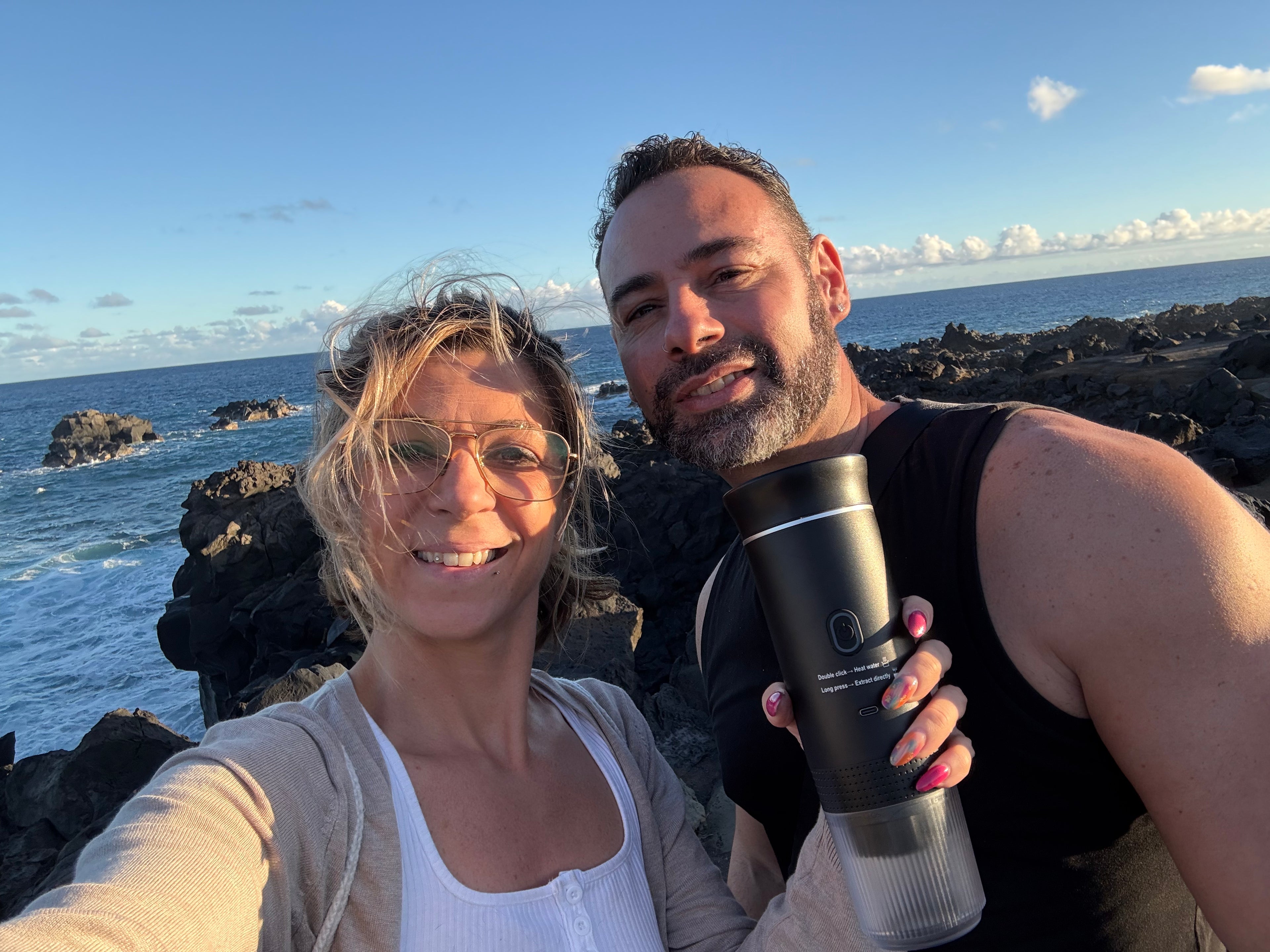 Alors, on a décidé de créer notre propre solution : une cafetière portable, compacte, rechargeable en USB, qui nous suit partout, tout le temps.